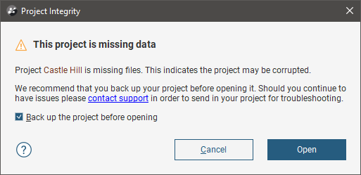 It is strongly recommended that you allow Leapfrog Geo to back up a project that has files missing before attempting to open or repair it.