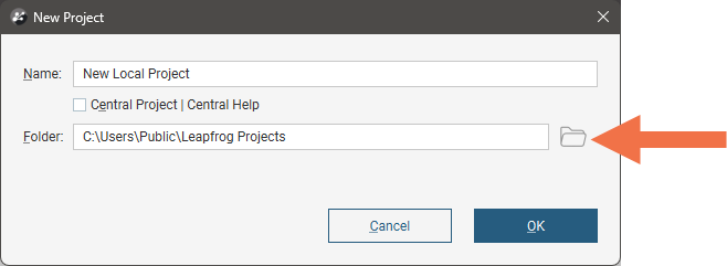 To create a local project, disable the Central Project option. The project will be saved in the location specified, but if you want to change it, you can do so by clicking on the folder button and navigating to a different folder.