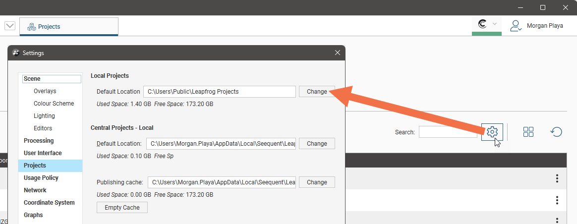 The folder the Projects tab searches for local projects can be changed by clicking on the Settings button: