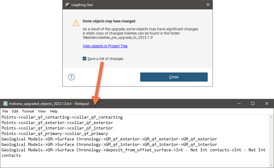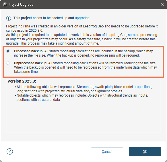 When you open a project that was last saved in an earlier version of Leapfrog Geo, you will be prompted to upgrade the project and a list of affected objects will be displayed. As part of this process, you will also be prompted to create a backup: