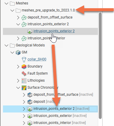 ) in the Meshes folder is linked to the upgraded surface that is part of a geological model (