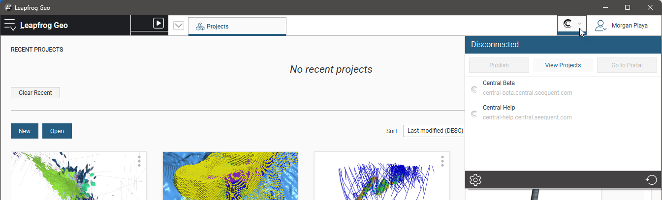 symbol are local Leapfrog Geo projects not connected to Central. Click on a local Leapfrog Geo project to open it. - Projects marked with the