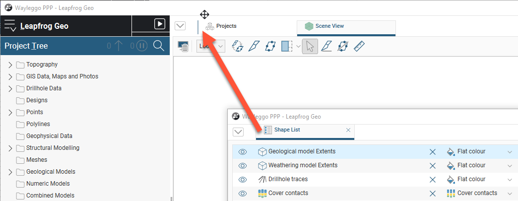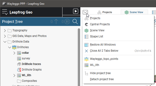 You can split the Leapfrog Geo main window into separate parts to make better use of your screen space. In addition, some Leapfrog Geo windows open in separate tabs that can be used either docked or detached. This topic describes how to change the main window to make the best use of your screen space. It is divided into:
