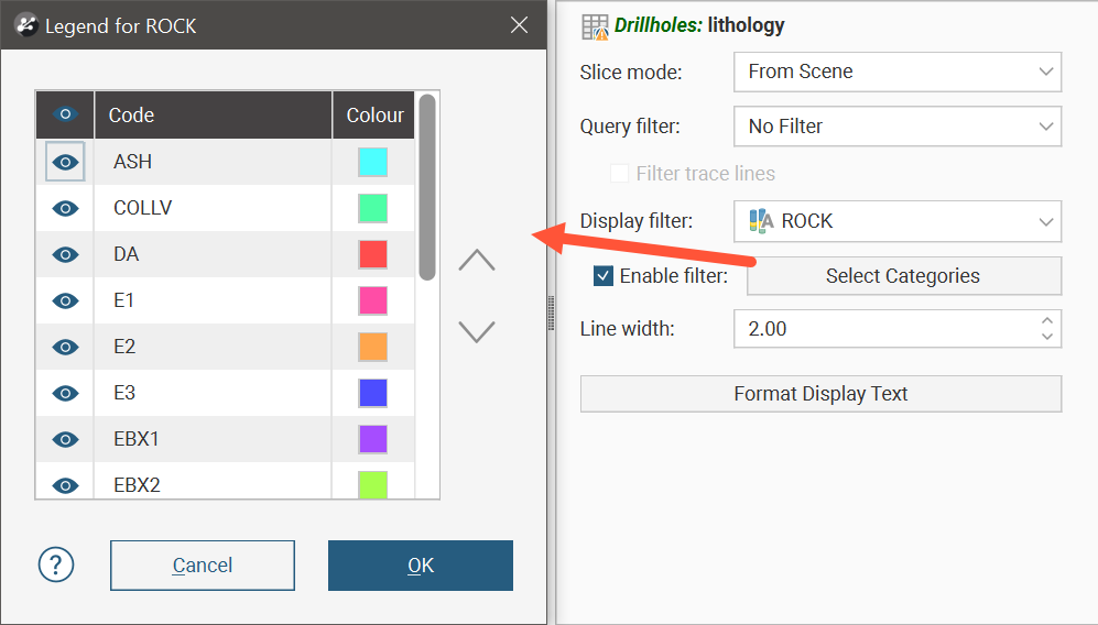 For a drilling data table, this displays only the data selected by the filter. The trace lines remain displayed in the scene. To filter out the trace lines so they are not displayed in the scene, tick the Filter trace lines box: