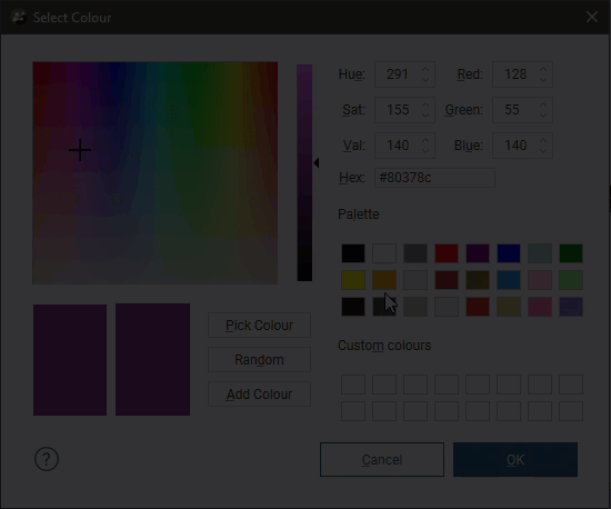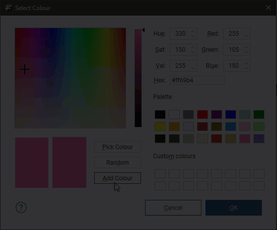 The Add Colour option adds the currently set colour to the Custom colours list. To remove a colour from the Custom colours list, drag another colour onto it.