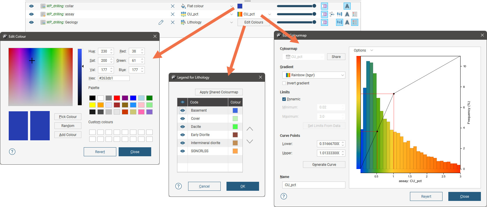 In the animations shown below, there is some banding due to the limitations of animated GIFs. In Leapfrog Geo, the Edit Colour window displays a wider range of colours.
