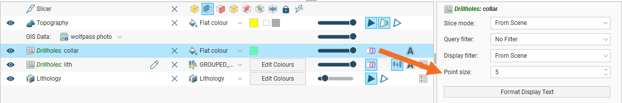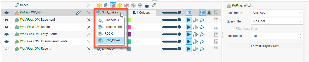 Many objects have a display colour list, which determines what data is used to display the object. For example, a lithology data table may contain several columns and the column displayed can be selected from the view list: