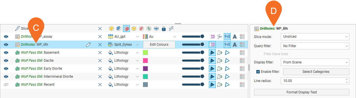 For example, if the object clicked on in the shape list is drilling data (C), controls specific to drilling data are shown in the properties panel: