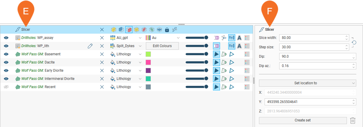 If, for example, the object clicked on is the slicer (E), finer controls for the slicer are displayed in the properties panel (F):