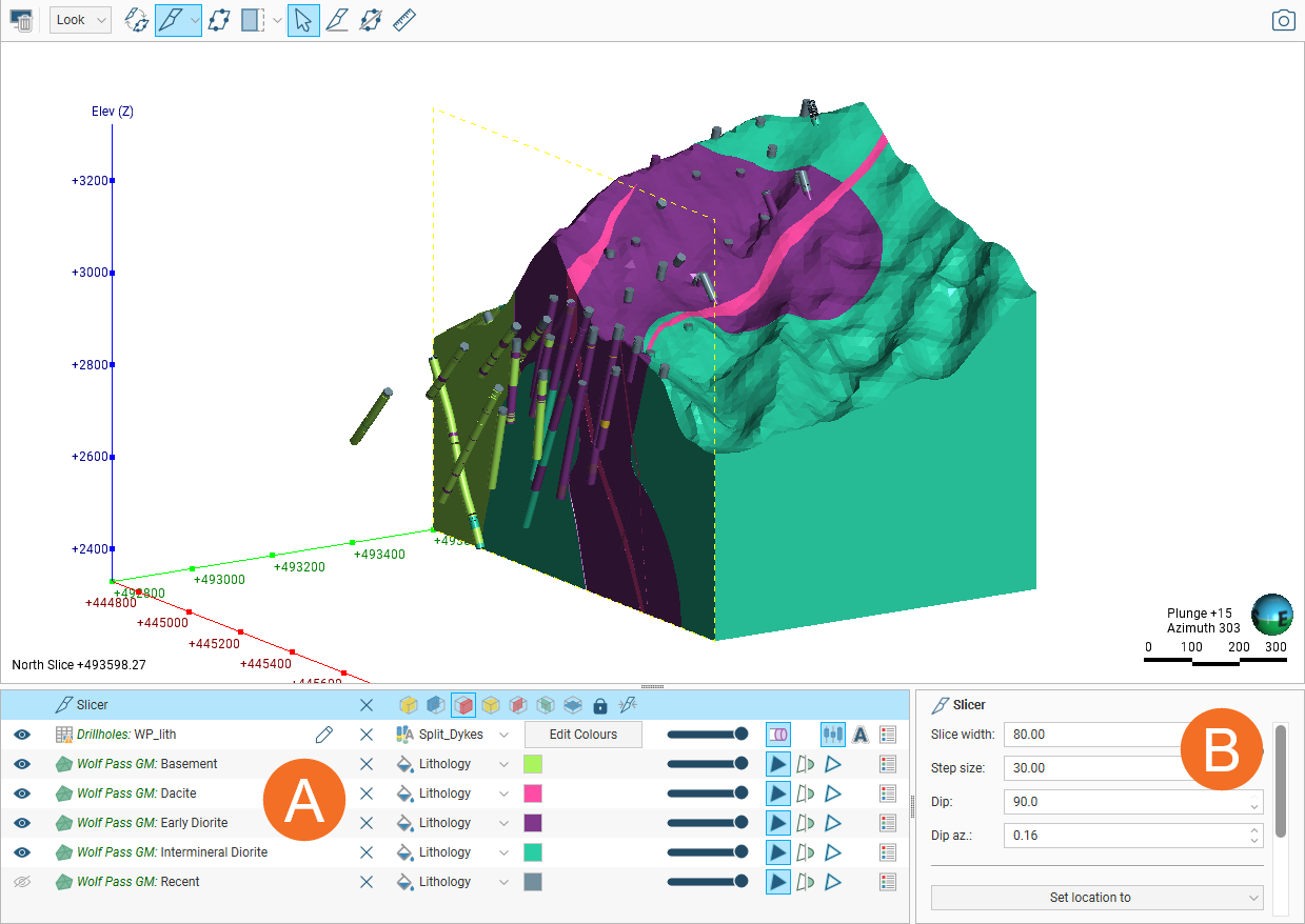 Visualising data is an important part of interpreting and refining data and making modelling decisions. In Leapfrog Geo, the appearance of objects in the 3D scene is controlled using the shape list and properties panel. Changing how you view objects in the 3D scene does not change those objects in the project tree. You can, therefore, freely experiment with changing how data is displayed without modifying the data itself.
