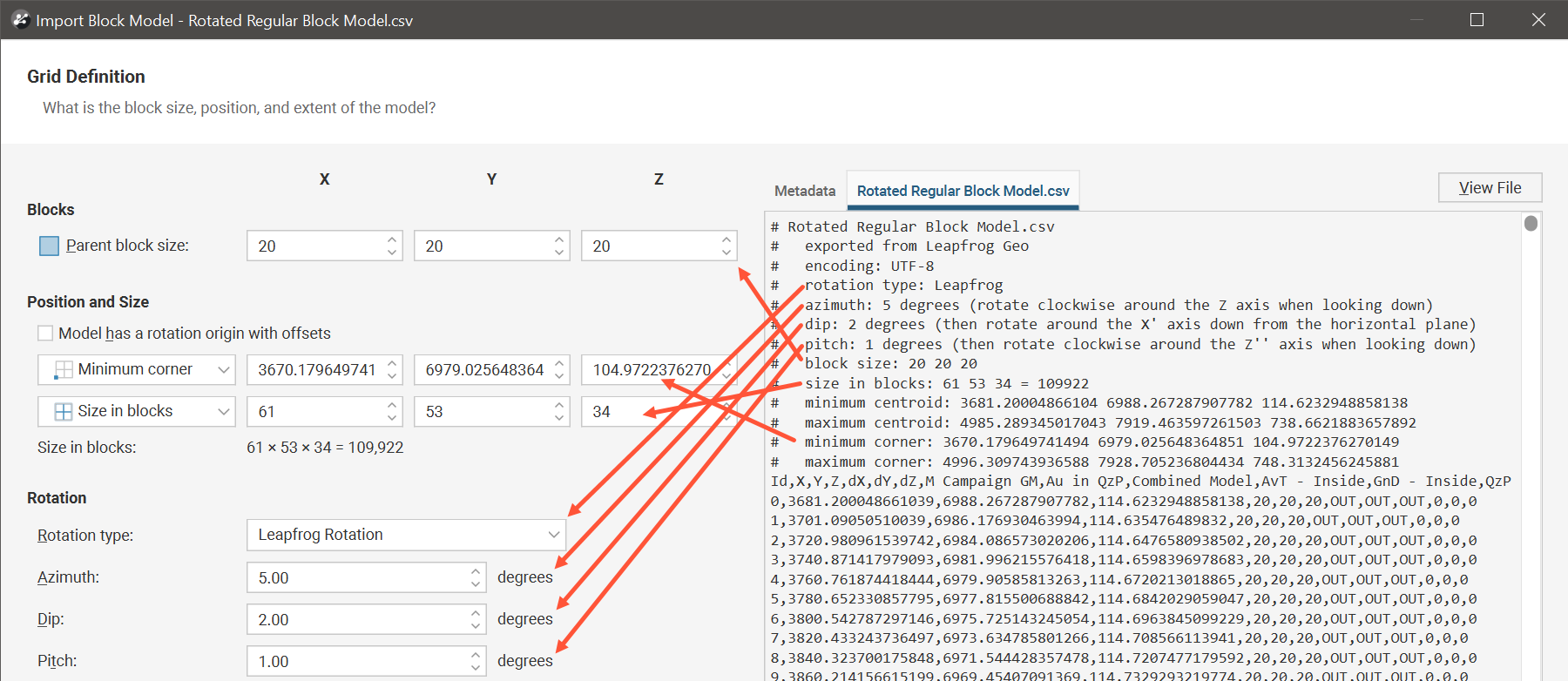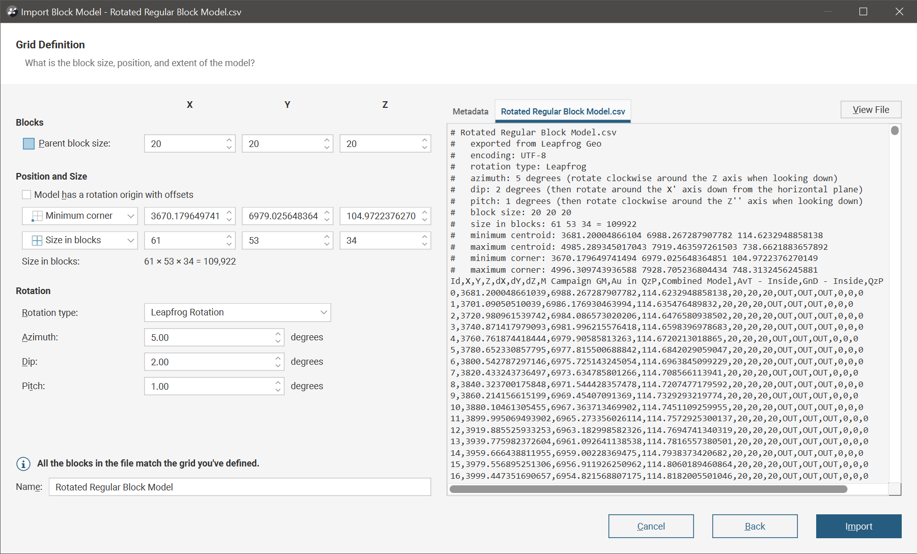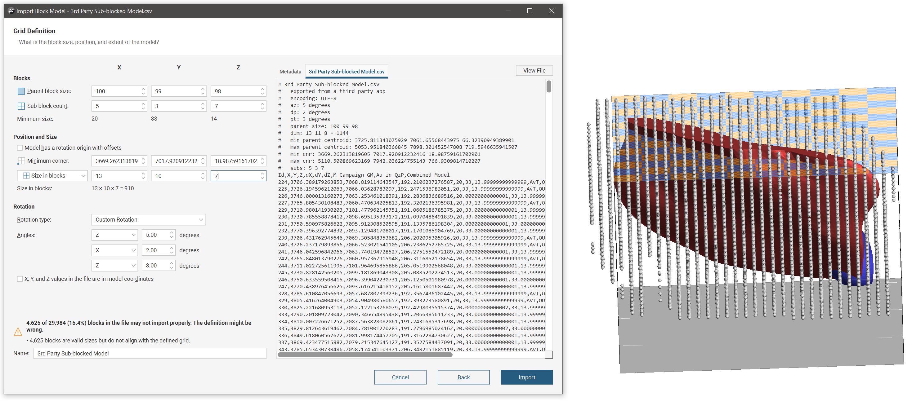 In the Grid Definition window, data from the CSV will be used to define the model’s block size, position and extents.