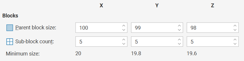 For sub-blocked models, the Sub-clock count specifies the number of sub-blocks per parent block in the X, Y and Z directions. The sub-blocks’ Minimum size is calculated from the sub-block definition data entered.