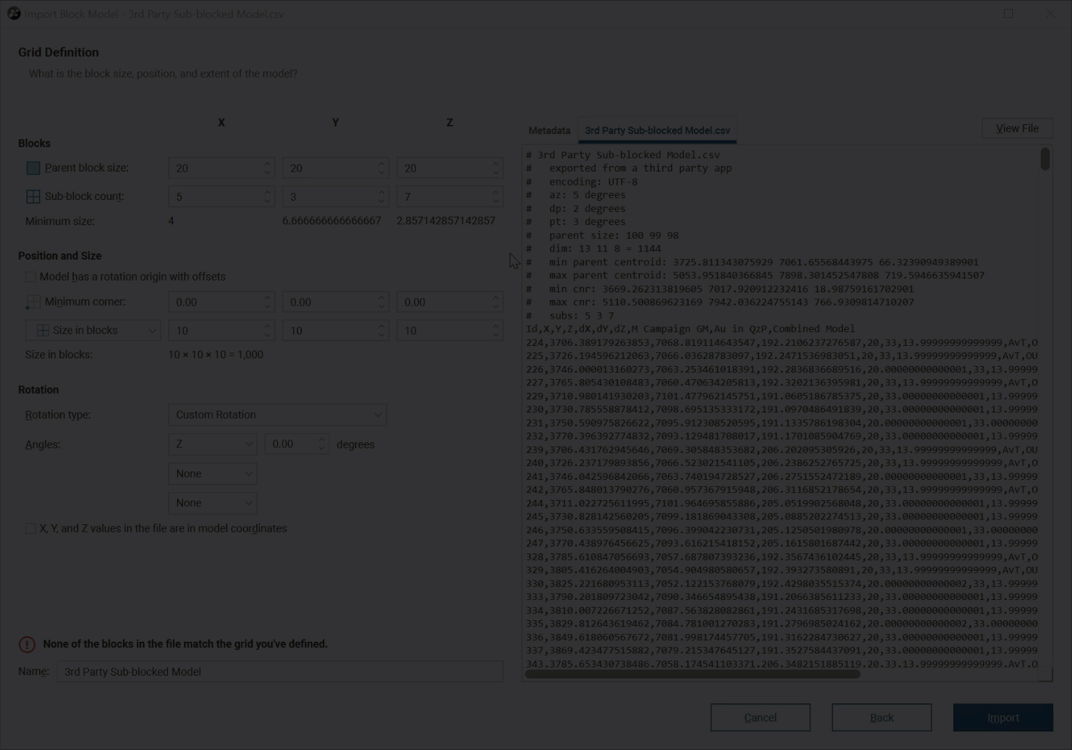 If you manually align the imported model to a grid definition, even if the importer reports that “all the blocks in the file match the grid you’ve defined” the resulting block model cannot be guaranteed to be the same as the block model exported to file. If at all possible, obtain the actual grid definition parameters and enter these parameters in the importer.