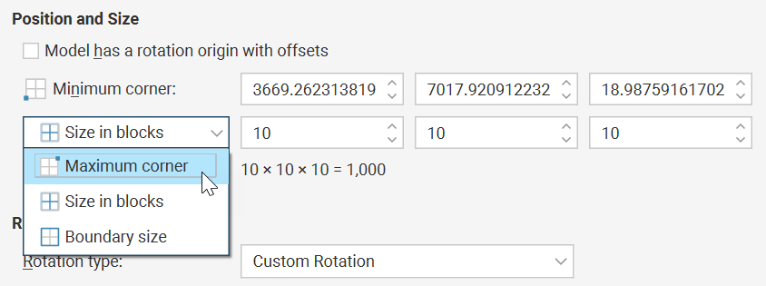 The location of the block model is specified by defining a Minimum corner position in X, Y and Z spatial coordinates.