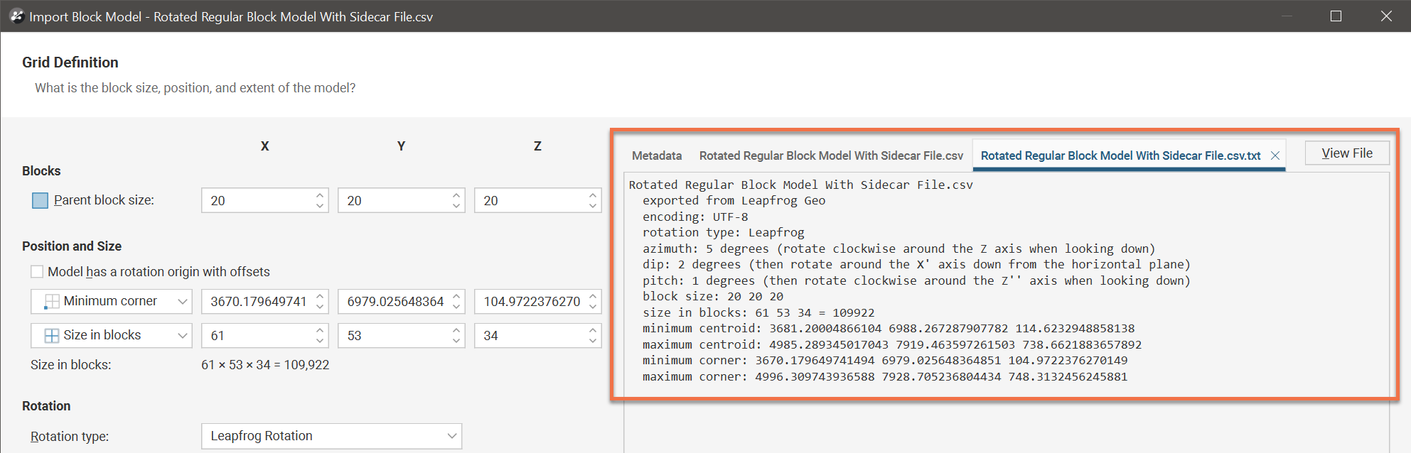 This window also includes a preview of the file to aid in selecting the type of block model.