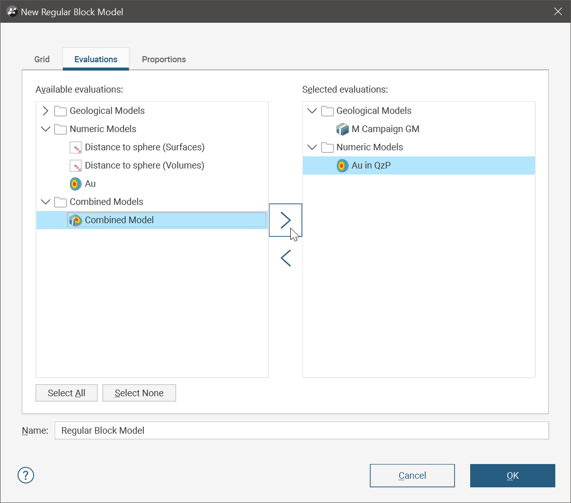 You can also evaluate the block model against geological models, interpolants and distance functions in the project. To do this, click on the Evaluations tab. All objects available in the project will be displayed. Move the models you wish to use into the Selected evaluations list.