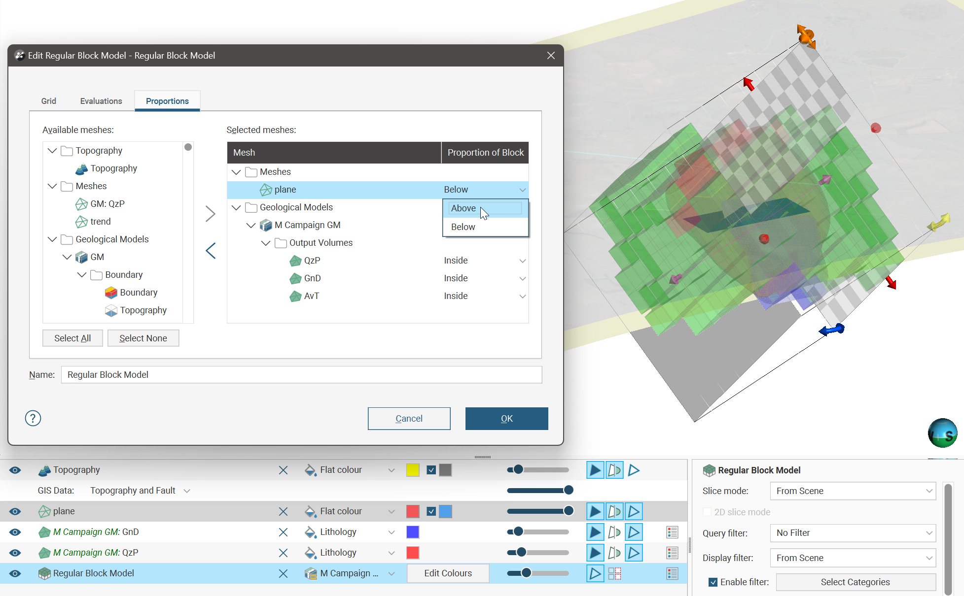 Each block will have a proportion calculated according to the ratio of each block relative to the Proportions of Block options for each surface. In the following example, a little less than half of the selected block is above the mesh called ‘plane’, and the exact proportion has been calculated as 0.430228. The same block has a proportion of 0.768231, or just under 77%, inside a mesh called ‘QzP’ (not shown).