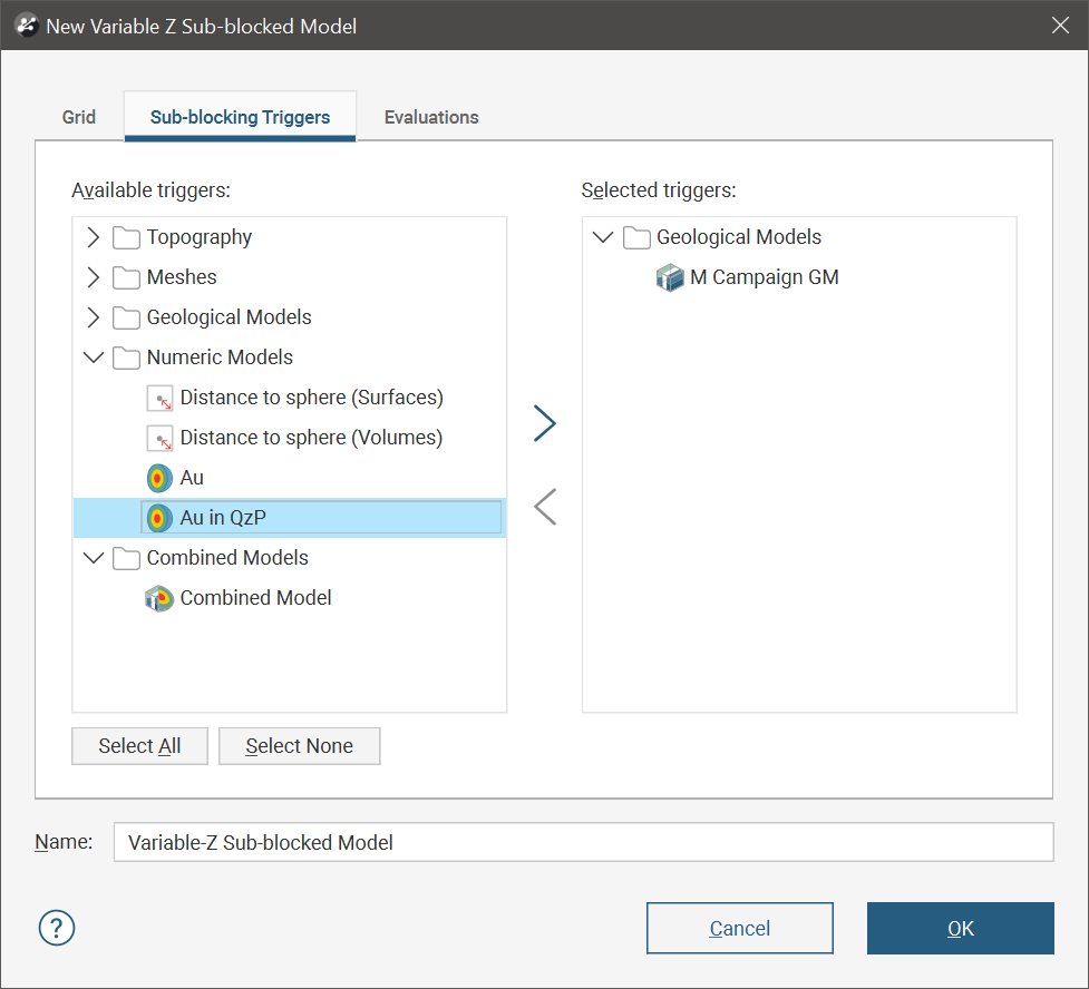 Once you have set sub-blocking triggers and evaluations, enter a Name for the variable z sub-blocked model and click OK. The model will appear under the Block Models folder. You can make changes to it by double-clicking on it.