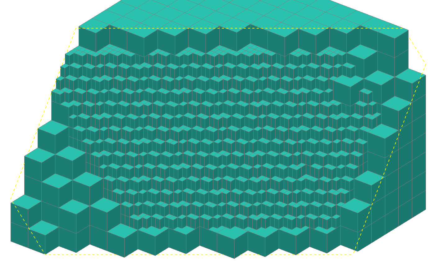 This same model has been sub-blocked with a sub-block count of 4 x 3 with Variable height ticked and a Minimum height of 10.0. The sub-blocks are regularly sized and placed in the X-Y plane, but the Z height of the sub-blocks are not regular in size or placement. The height of a block is not divided into multiple sub-blocks, but the single block can be any height between 0 and the block height. The variable height block is measured inward from the top or the bottom edge of the block, making variable height blocks grow up and down from the block boundary, but sub-blocks will not hover between the top and bottom edges of parent blocks.