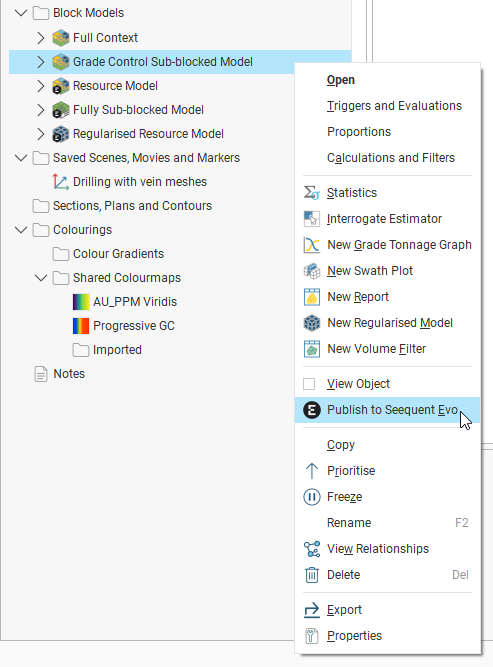 To start, right-click on the block model you wish to publish and select Publish to Seequent Evo: