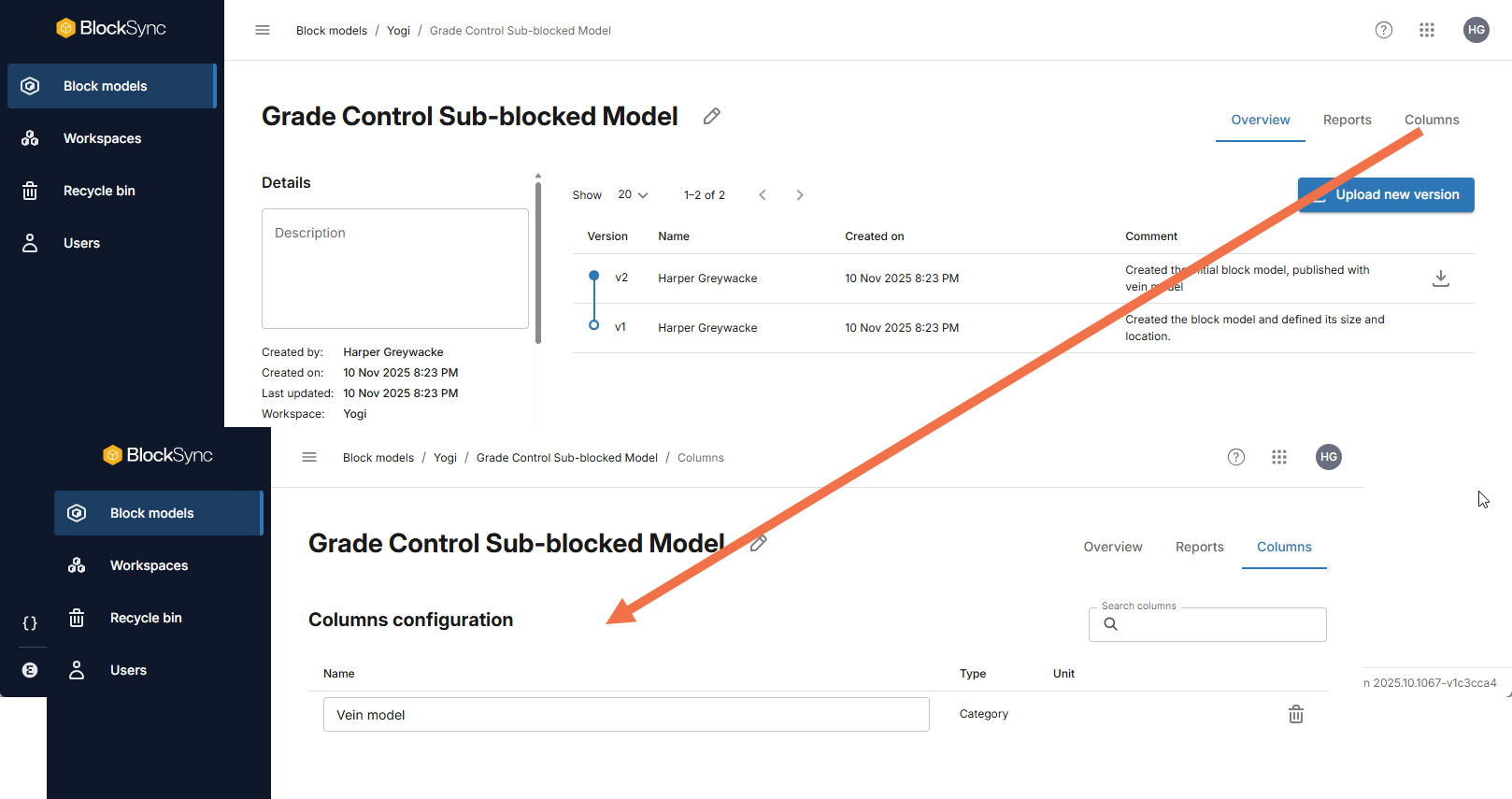 In BlockSync, a newly uploaded model will have two versions, a version representing the initial creation of the block model and one for its first publish. Click on the Columns tab to view the columns uploaded: