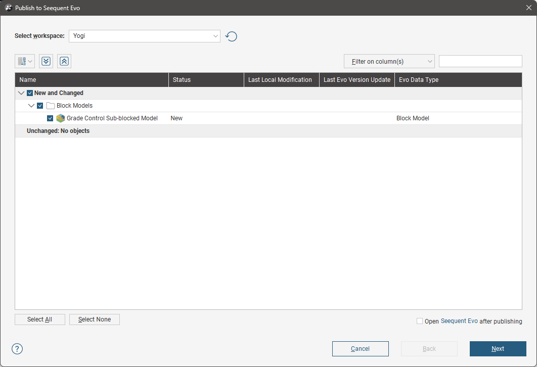 In the window that opens, the block model will be pre-selected. Select the workspace the model should be published to, then click Next.