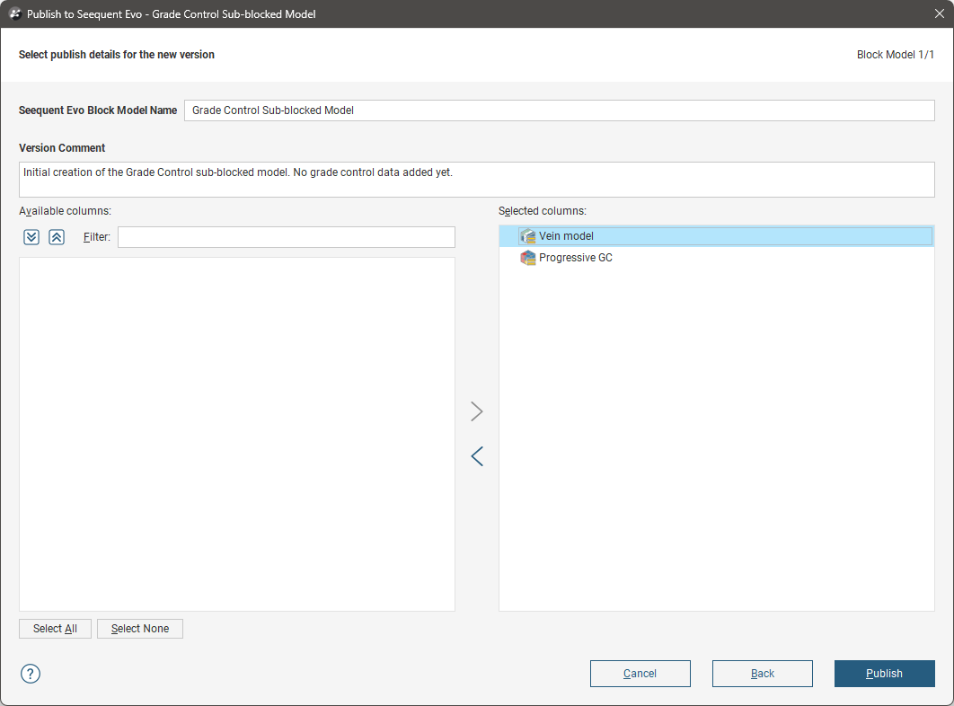 Selecting a good block model name and descriptive version comment will help other team members working on the model understand the content of the published version.