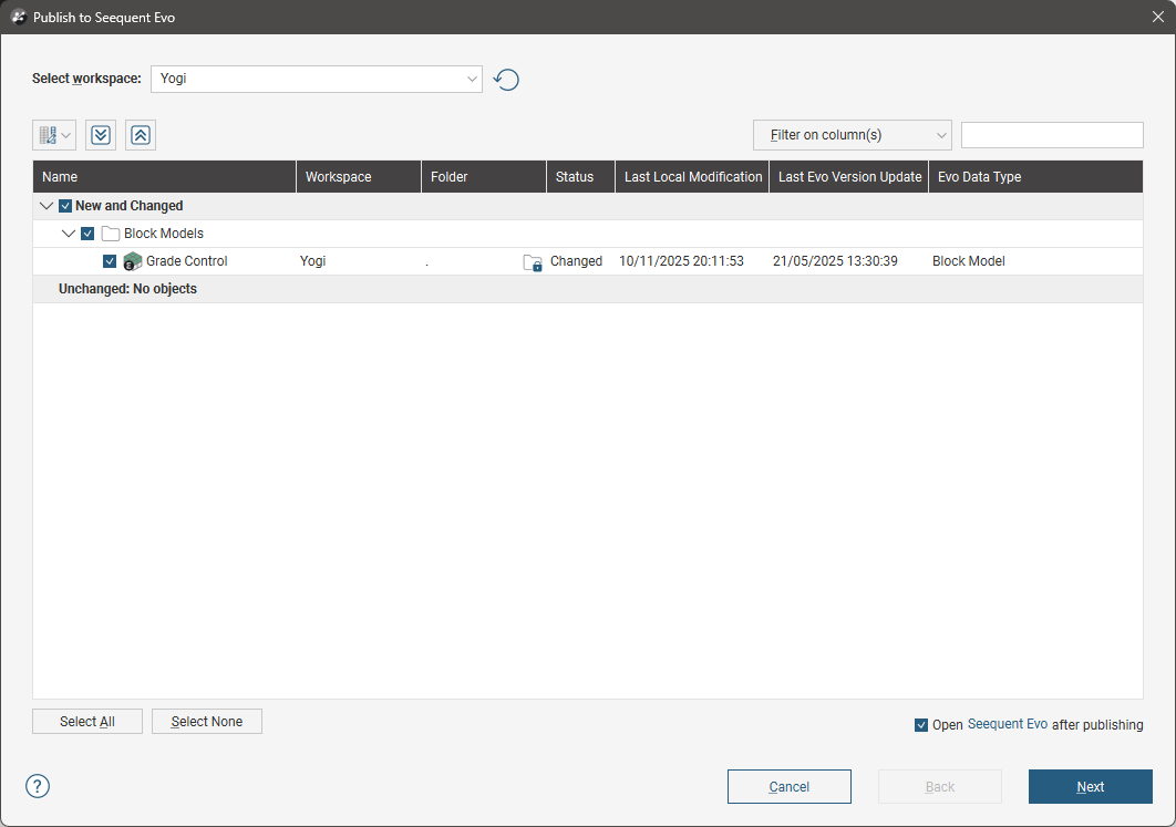 When you have made changes to the block model and are ready to publish those changes to the wider team, right-click on the block model and select Publish to Seequent Evo. In the window that opens, the block model will be selected. Choose the workspace the model should be published to, then click Next.