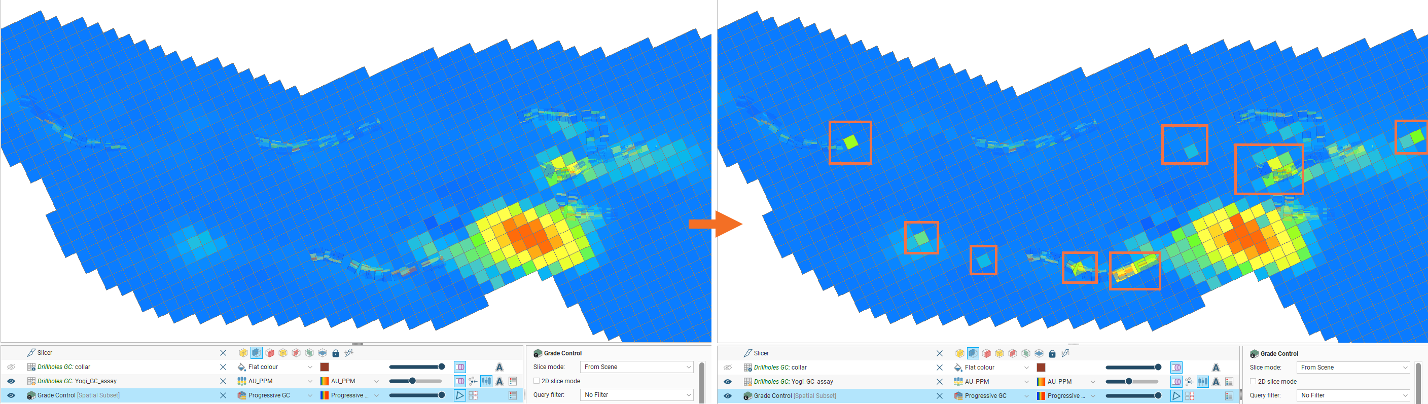 These images show slices through a block model before and after the block model’s evaluations were updated with grade control data, with some of the notable differences highlighted: