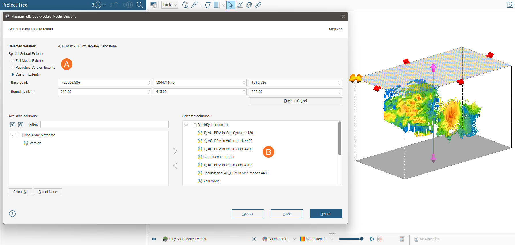 For regular blocks models, you can choose which columns to reload. For sub-blocked models, all BlockSync imported columns need to be selected; this constraint means that BlockSync can maintain a single sub-blocking structure across all columns.