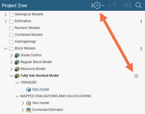 When a new version of a BlockSync-linked block model is available in Seequent Evo, an out-of-date indicator will appear at the top of the project tree and next to the out-of-date objects: