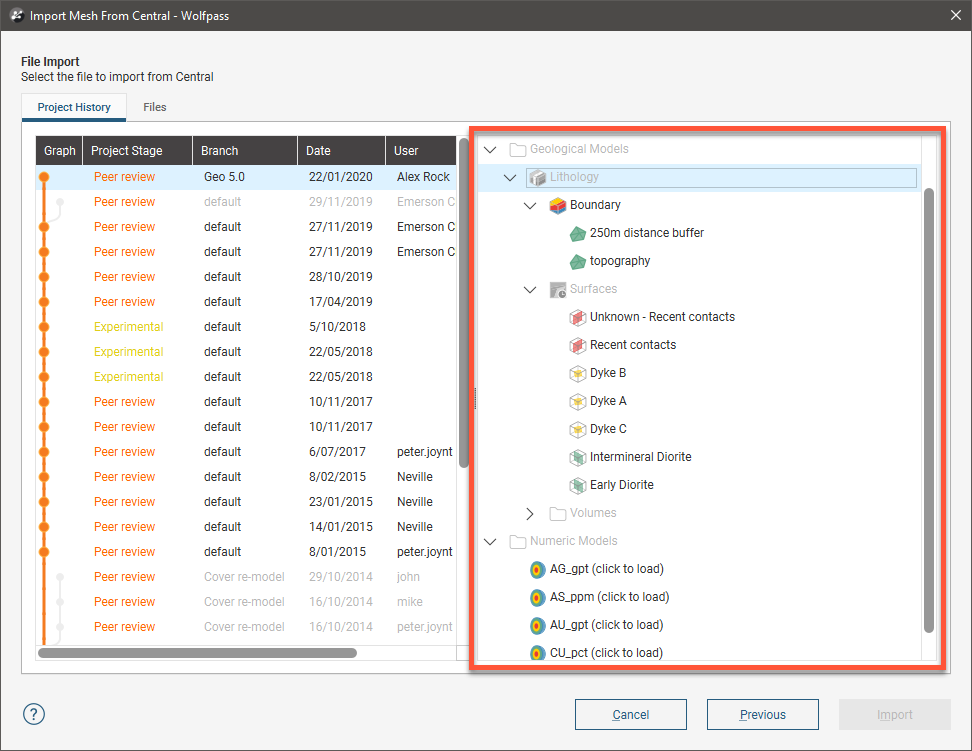 In the Project History tab, select a revision to view its published objects, then click on a model to load its list of objects. The list displayed will depend on the type of data object you are importing. Here, the surfaces in the project are displayed: