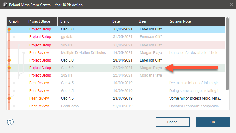 The revision on branch 2021r1 dated 31/05/2021 does not have a copy of this mesh and so is highlighted in red. All revisions in white have a copy of this mesh, and clicking OK will load the copy of the mesh from the Geo 6.0 branch published on 31/05/2021, highlighted in blue.