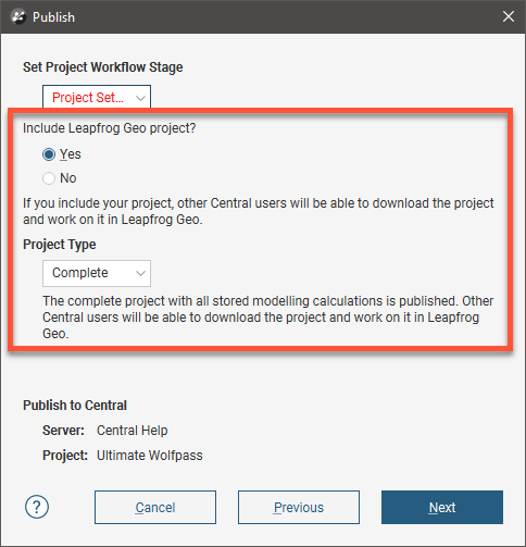 - Complete.This option publishes the complete Leapfrog Geo project, including stored modelling calculations. Other Central users will be able to download the project and work on it in Leapfrog Geo without reprocessing the project.
