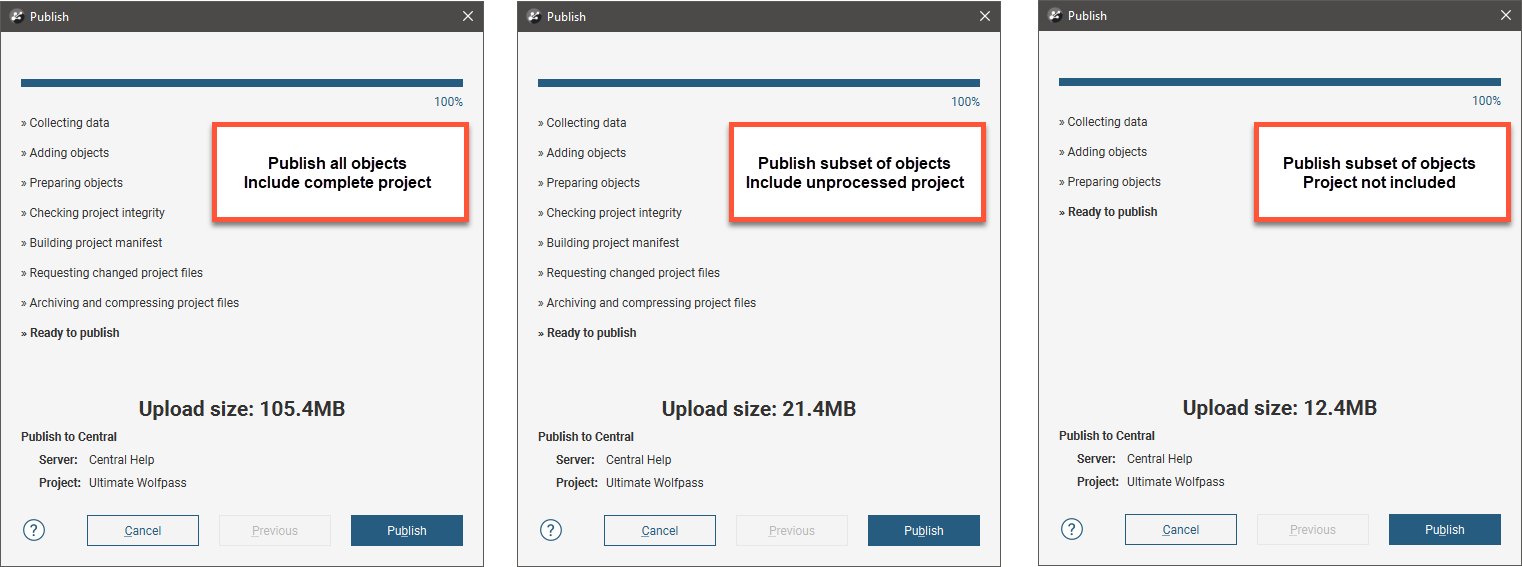Another consideration in choosing when to publish is how large the publishing upload will be, as publishing many objects and/or including the Leapfrog Geo project can result in a large upload that takes some time. Here, for example, are three upload summaries for the same project. The first upload includes all objects, plus the full project, the second includes a limited set of objects and an unprocessed version of the project, and the third upload is only a limited a set of objects: