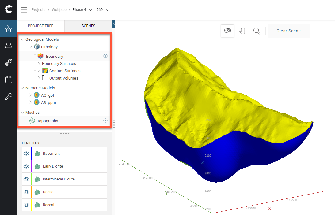 In the Central Portal, it will be possible to visualise the Topography mesh, the surfaces in the Lithology geological model and the surfaces in the AG_gpt and AS_ppm numeric models from the Wolfpass project: