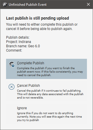 This occurs when a previous publish event was interrupted. Choose from the options presented.