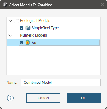 A combined model uses information from up to four geological models, interpolants and distance functions in order to visualise relationships between different types of data in the project. For example, you could combine a geological model with an interpolant to see what lithologies higher grades are occurring in.