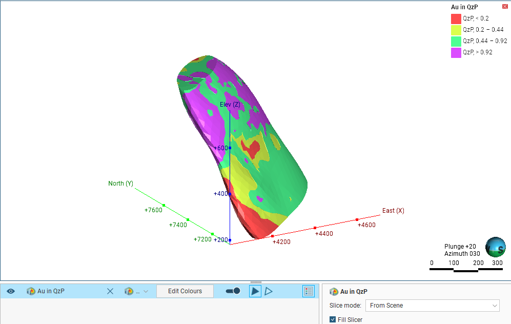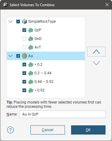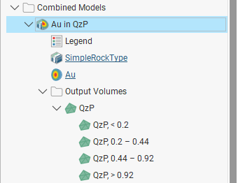The next step is to select the output volumes to use in the combined model and arrange them in order of priority. For this combined model, the QzP volume from the selected geological model will be subdivided using information from the Au interpolant: