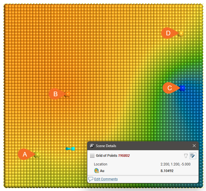 In the above diagram, points A and B will have the most effect on point X as they are closer to X than points C and D. Using the linear interpolant function in Leapfrog Geo gives a value of 7.85, which is between the nearby high grade values of A (10) and B (7). Because of their distance from X, the low grade values at C and D have a much weaker effect on the estimate of point X, and they have not dragged the estimate for X lower.