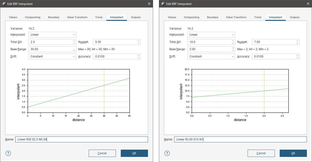 A linear interpolant has no sill or range in the traditional sense. Instead, the Total Sill and Base Range set the slope of the interpolant. The Base Range is the distance at which the interpolant value is the Total Sill. The two parameters sill and range are used instead of a single gradient parameter to permit switching between linear and spheroidal interpolant functions without also manipulating these settings.