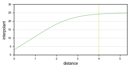 The yellow line indicates the Base Range. For this interpolant, the value of the interpolant is offset by the value of Nugget.