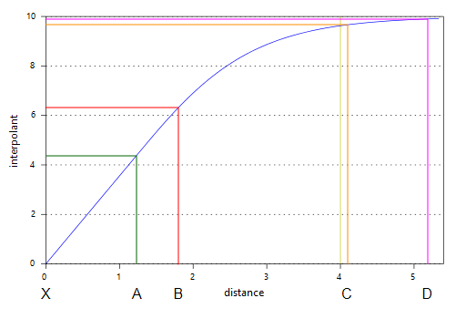 Known values within the range are weighted proportionally to the distance from X. Known values further from X than the range will all be given approximately the same weight, and have about the same influence on the unknown value. Here, points A and B are near X and so have the greatest influence on the estimated value of point X. Points C and D, however, are outside the range, which puts them on the flat part of the spheroidal interpolant curve; they have roughly the same influence on the value of X, and both have significantly less influence than A or B: