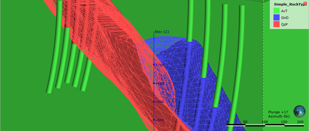 To see the effect of different resolution settings, consider a simple geological model of three rock types. Here, the surface resolution is set to 50 and the adaptive isosurfacer is disabled: