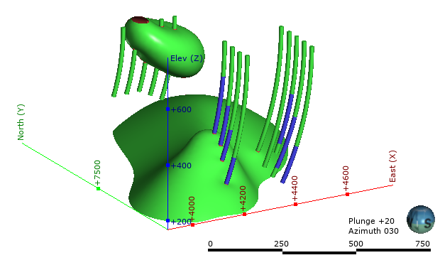 The intrusion surface has two bodies that are not connected, and we can apply a trend to connect the two parts. Here, the intrusion surface has been hidden in the scene and the scene rotated to line up the QzP segments. A plane line can then be drawn through the QzP segments: