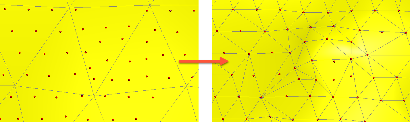 Snapping forces surfaces to honour the specified contacts, moving triangles on the surface so that the surface precisely intersects the contact. For example, snapping is disabled for the surface on the left, but enabled for the surface on the right. The points used to generate the surface are shown in red, and the triangles are displayed so you can see how snapping to data affects the surface: