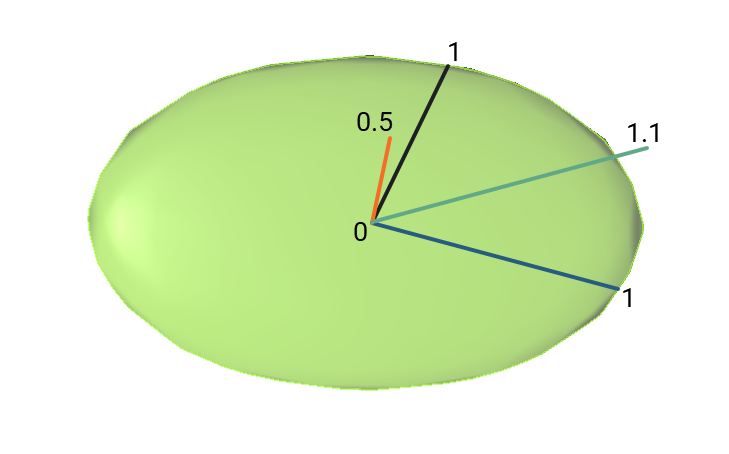 Anisotropic distances are not stored in project units, as this would create additional confusion. Instead, anisotropic distances such as MinAD and AvgAD are stored as proportions of a reference surface. In the case of MinAD and AvgAD, it is the search ellipsoid. All points lying on the surface of the ellipsoid have a value of 1 relative to the centre of the search ellipsoid. Consider a point within the search ellipsoid: A line drawn from the centre of the ellipsoid through that point to the surface of the ellipsoid extends from the 0 distance at the centre to the surface at anisotropic distance 1. The anisotropic distance of the point from the centre will be between 0 and 1, in proportion to its position along that line. If a point is outside the surface, the anisotropic distance would be greater than 1.