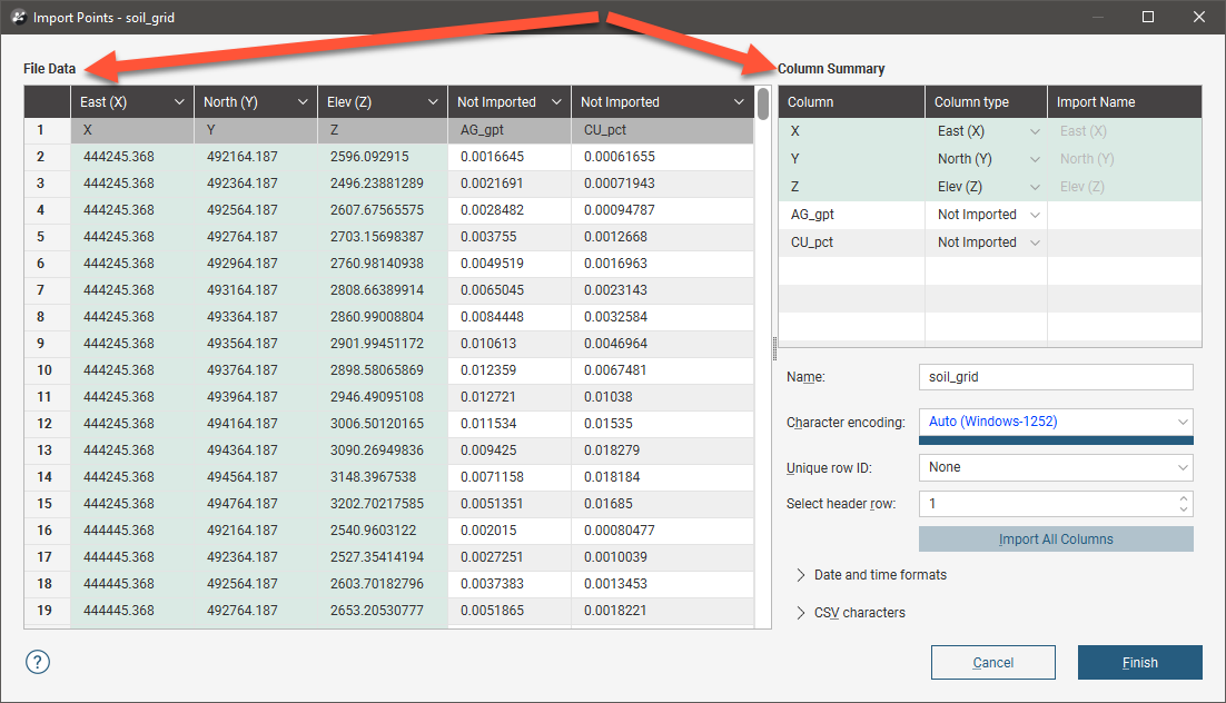 Once you have selected the file or files to be imported, Leapfrog Geo prompts you to map the columns in the file to the expected format. For example, here we are importing a set of points. File Data shows a snapshot of the data in the file. The Column Summary shows what columns are in the file and how Leapfrog Geo will map these columns, unless you make changes in this window.