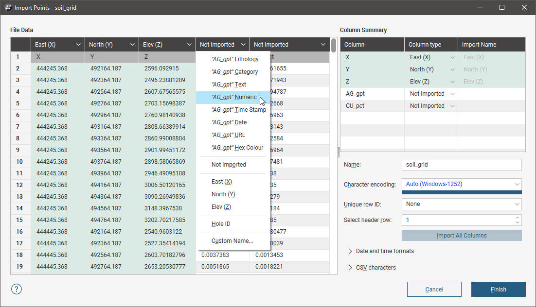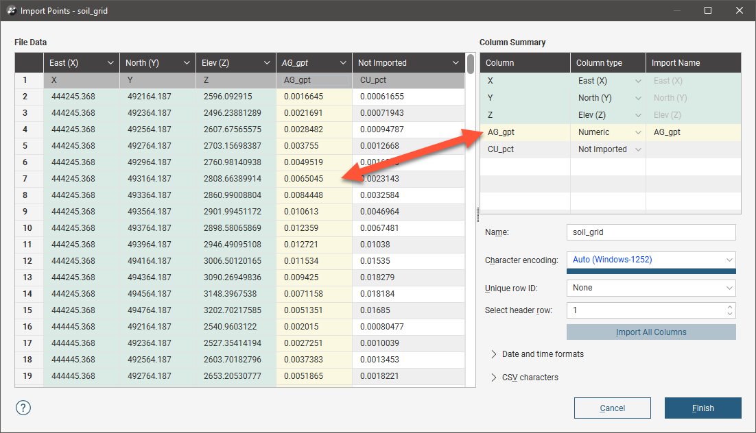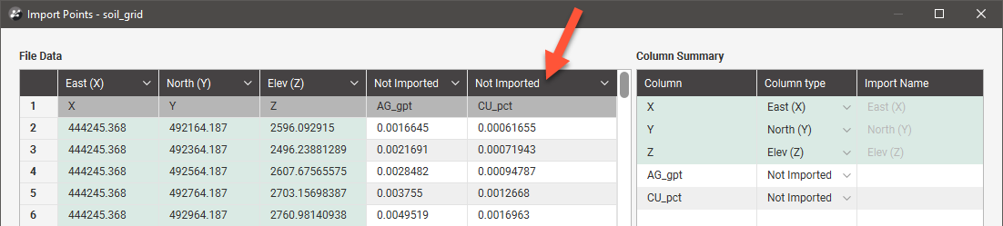 The AG_gpt and Cu_pct columns are currently marked as Not Imported.