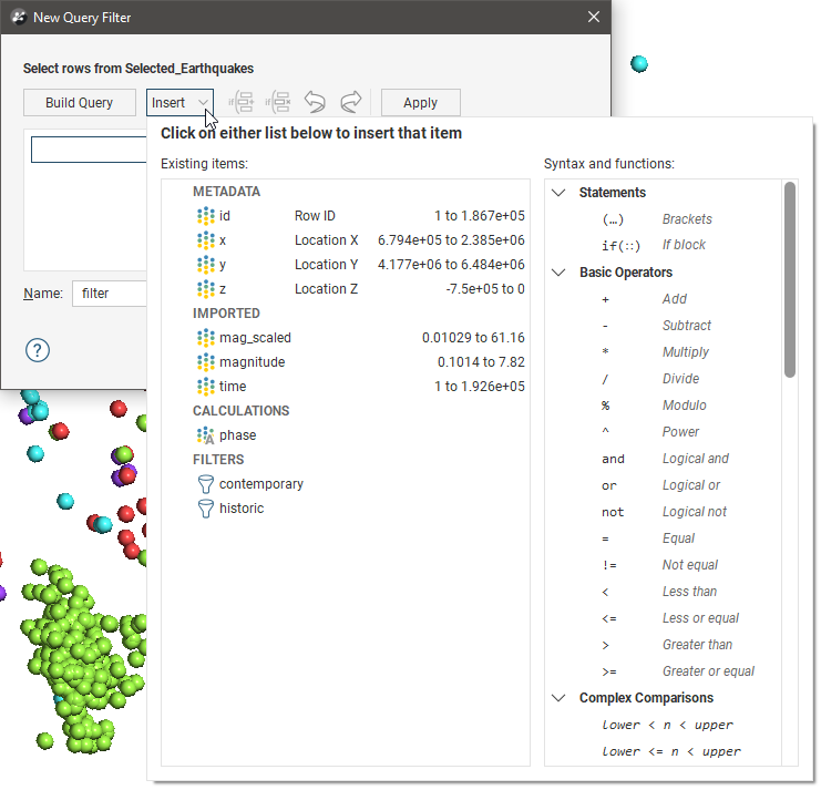 Click the Insert button to expand the window to see an adjacent ready reference. This provides quick access to all the numeric columns, metadata variables, operators and functions that can be used in constructing a query.